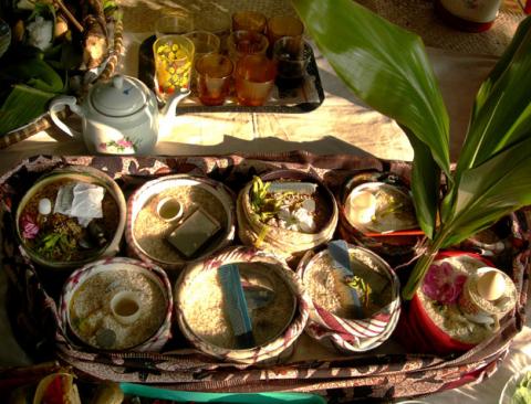 Sesaji untuk upacara Ngalaksa terdiri atas beras ketan, minyak wangi, bunga, beras, kaca, sisir, uang koin, telur, dan daun hanjuang (kanan). Ngalaksa adalah tradisi masyarakat Rancakalong, Jawa Barat, sebagai wujud syukur kepada Tuhan atas panen yang melimpah.