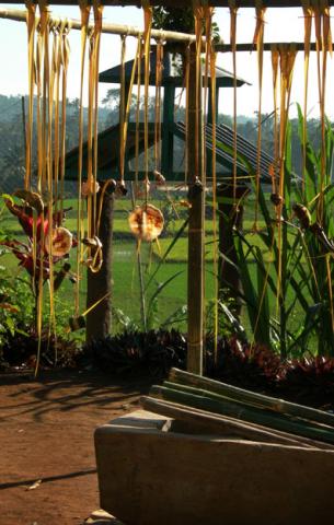 Beberapa jenis makanan olahan dari beras digantung menggunakan janur sebagai hiasan sekaligus pembatas ruang untuk menumbuk padi menggunakan lisung dan halu dalam rangkaian upacara ngalaksa di Desa Wisata Rancakalong; Kabupaten Sumedang pada 5 Juli 2007.