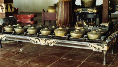 Bonang berlaras pelog milik Museum Kraton Kasepuhan, memiliki tujuh pasang penclon berbahan perunggu.