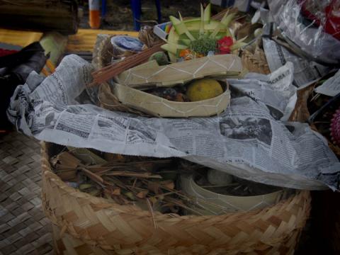 Macam-macam sesaji untuk pementasan Wayang Lemah dalam upacara Melasti di Pantai Saba; Kecamatan Blahabtuh; Kabupaten Gianyar; Bali pada 2 Juli 2014.