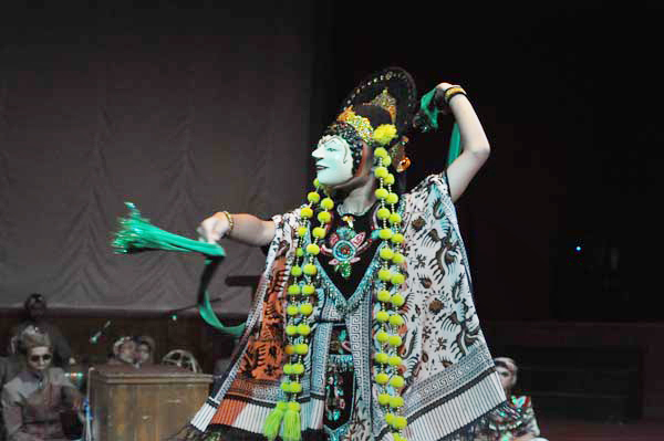 Gerakan ngola soder (memainkan selendang) dalam tari topeng Pamindo gaya Losari oleh penari Luh Saraswati dala pergelaran topeng Losari di STSI Bandung, 17 November 2012.