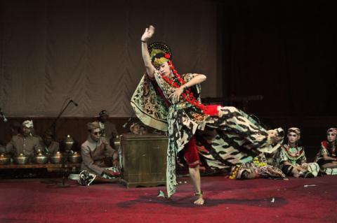 Nur Anani, dalang topeng dari Losari, Cirebon, tengah menarikan tari topeng Klana yang berkarakter gagah di STSI Bandung, 17 November 2012.