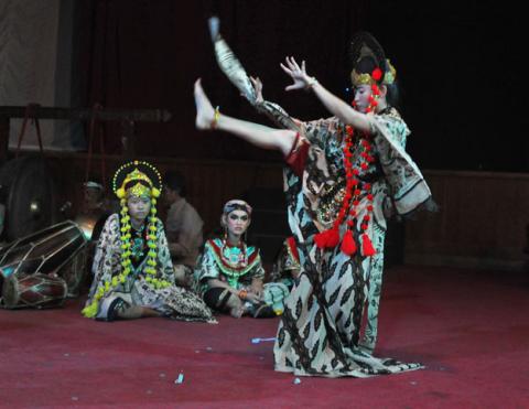 Nur Anani, dalang topeng (penari topeng) asal Cirebon memeragakan gerakan sépak sodér (menendang selendang) pada tari topeng Klana bagian baksarai (tari sebelum pakai kedok) dalam pergelaran di STSI Bandung, 17 November 2012.